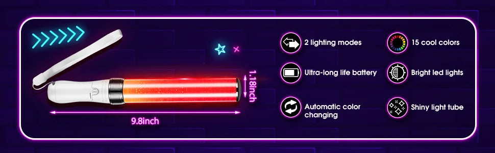 The K-Pop Color Changing Lightstick is a reusable LED glow stick designed for concerts, parties, weddings, and fan events. With 15 vibrant color options and easy color-changing functionality, it creates an exciting and immersive atmosphere.